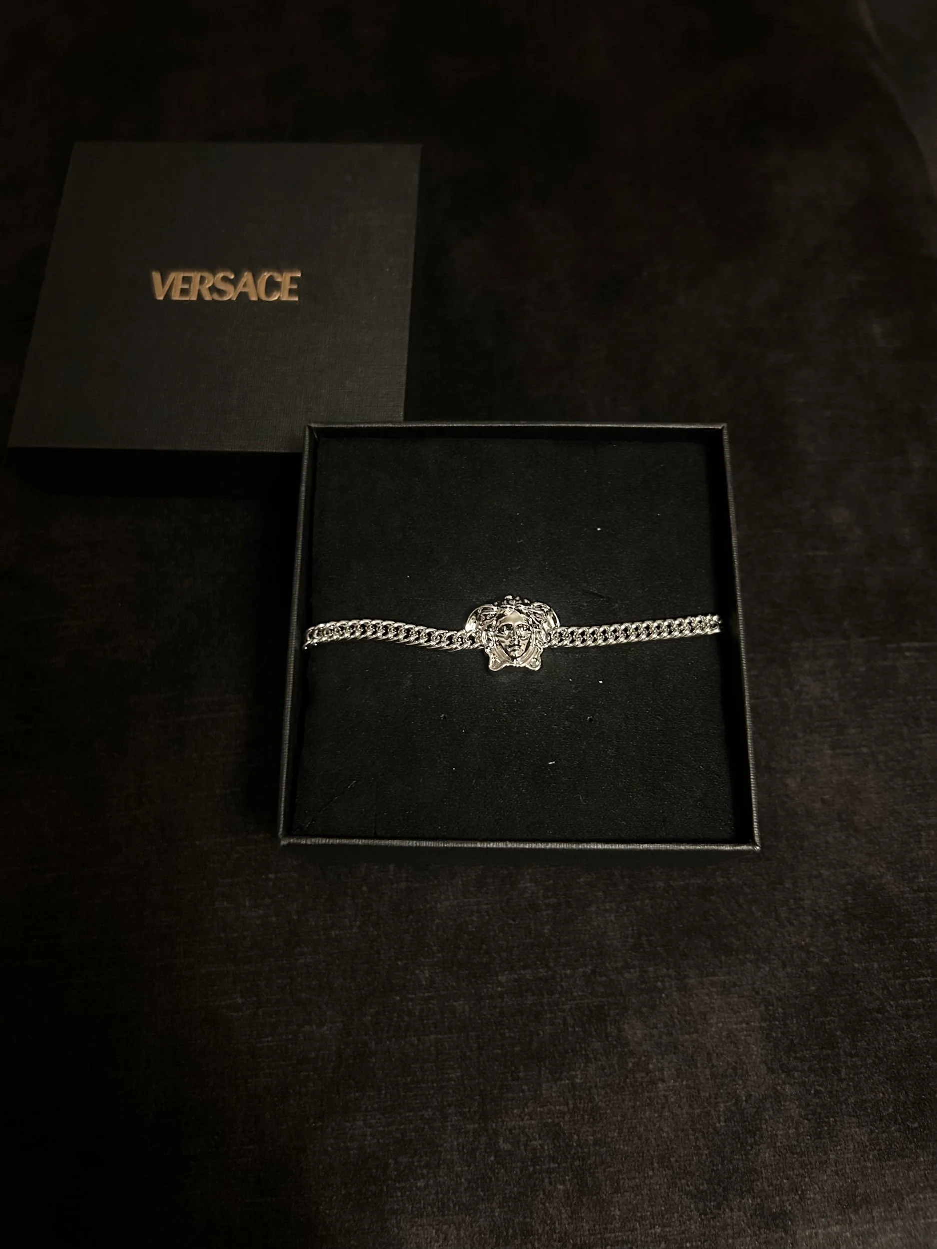 An expression of timeless opulence, this chain bracelet embodies the bold identity of Versace. Crafted from polished metal with a lustrous silver-tone finish, the design features a finely woven chain centered by the iconic Medusa head, a symbol of power, beauty, and strength that defines the House’s unmistakable aesthetic.